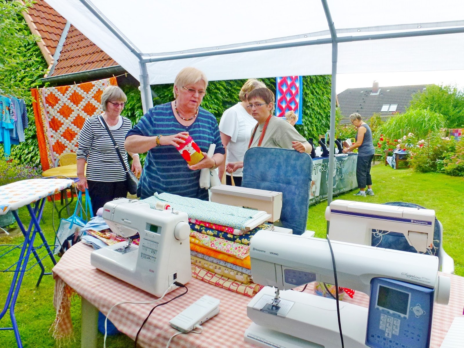 06.07. 2014, traumhaftes Wetter und ein wunderschön, mit tollen Quilts geschmückter Garten bei Stoff-Flausen Regine Wiemer, verspricht einen schönen Tag.